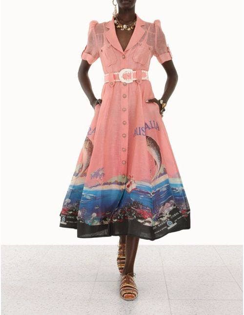 Это платье Zimmermann LUX-62536 представляет собой настоящее произведение искусства, сочетающее в себе стиль и эксклюзивный дизайн. Яркий принт с морскими мотивами, напоминающий винтажную открытку, придает платью неповторимый шарм. Силуэт платья подчеркивает женственность, а детали, такие как пуговицы по всей длине и объемные рукава, добавляют элегантности.